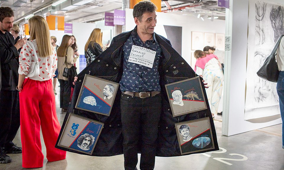 Александр Петрелли, знаменитый своей мобильной галереей «Пальто», где произведения висят на подкладке настоящего пальто, которое носит галерист, несколько раз менял свою экспозицию — в какой-то момент там появились, например, вольные рисунки женских ню Дмитрия Пименова, арт-революционера и поэта, по 15 тыс. руб. за штуку. Классической теме «обнаженки» посвятила свой стенд и галерея «Виктория» из Самары. Абстрактные произведения Владимира Дубосарского (120 тыс. руб. за штуку), гораздо больше известного своими фигуративными картинами, предложила галерея ARTZIP, наряду с новой каллиграфической серией Андрея Логвина.