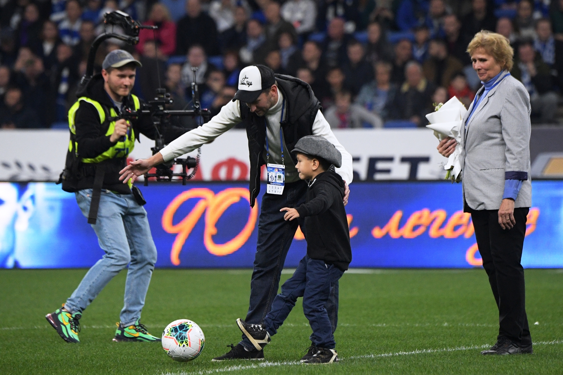 - Правнук вратаря Льва Яшина Лев Фролов (в центре на первом плане) делает первый удар по мячу в матче 13-го тура чемпионата России по футболу среди клубов Премьер-лиги между «Динамо» и «Краснодаром». Справа налево: дочь и внук вратаря Льва Яшина Ирина и Василий Фроловы