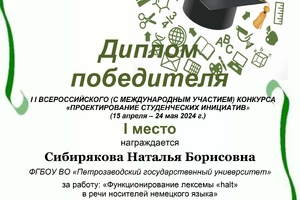 Работа  студентки Института иностранных языков ПетрГУ на тему "Функционирование лексемы halt в речи носителей немецкого языка" была признана лучшей в направлении "Иностранные языки. Немецкий язык (Исследовательские проекты)".