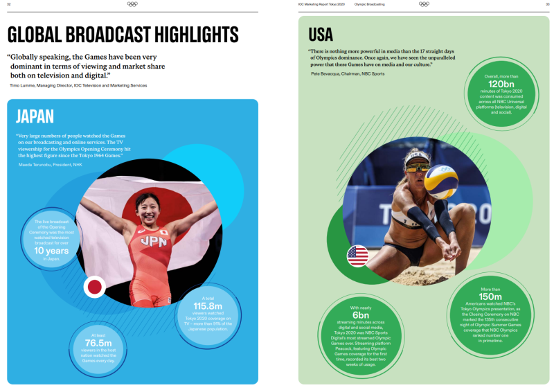 Так, американская компания NBC транслировала Олимпиаду в Токио на аудиторию в 150 миллионов зрителей. Ближайший конкурент британский телеканал BBC охватил только 104 миллиона зрителей. Это рекордные показатели за всю историю Олимпийских игр.