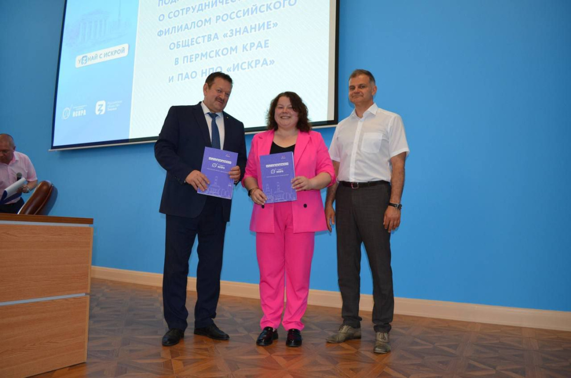 В Прикамье научно-производственное объединение «Искра» заключило соглашение с филиалом Российского общества «Знание» в Пермском крае и региональным отделением Российского движения детей и молодежи «Движение первых». Подписи под документами поставили генеральный директор предприятия Сергей Юрасов, руководитель филиала Общества «Знание» Татьяна Трубинова и председатель краевого «Движения Первых» Александр Мясников.