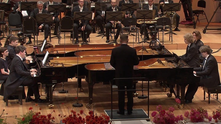 Главная интрига вечера – мировая премьера Концерта для четырех фортепиано с оркестром Александра Чайковского. Настоящее испытание для пианистов. Здесь надо проявить ансамблевое искусство, технические способности и актерское мастерство. "Это история о пианистах, о жизни пианистов в целом", – пояснил композитор, народный артист России Александр Чайковский.