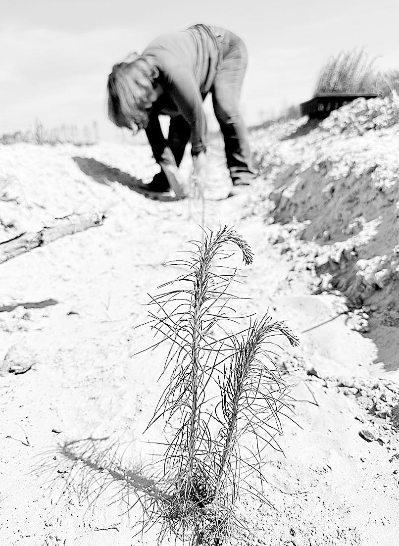 Ах, меч Колесова, сколь чувствительна твоя тяжесть! Правда, в этот раз мы увидели модифицированный его вариант. Он специально разработан для саженцев с закрытой корневой системой. Вместо литого ножа — калиброванный конус точь-в-точь такого размера, как пластиковая ячейка с грунтом, в которую несколько месяцев назад было положено семечко. Нажимаешь на педаль — и в земле остается коническая лунка, в которую аккуратно пристраивается малютка-саженец, очень похожий на пушистого цыпленка, только зеленого цвета. Eще шаг — еще лунка, еще и еще… Огромная пустошь, отпечаток бывшего пожара, расчерчена на узкие полосы. У каждой посадочной — параллельная, которая позволит ухаживать за сосновым детским садом. И всюду добровольцы, которые двигаются к дальнему лесу, у которого остановился или был остановлен огонь.