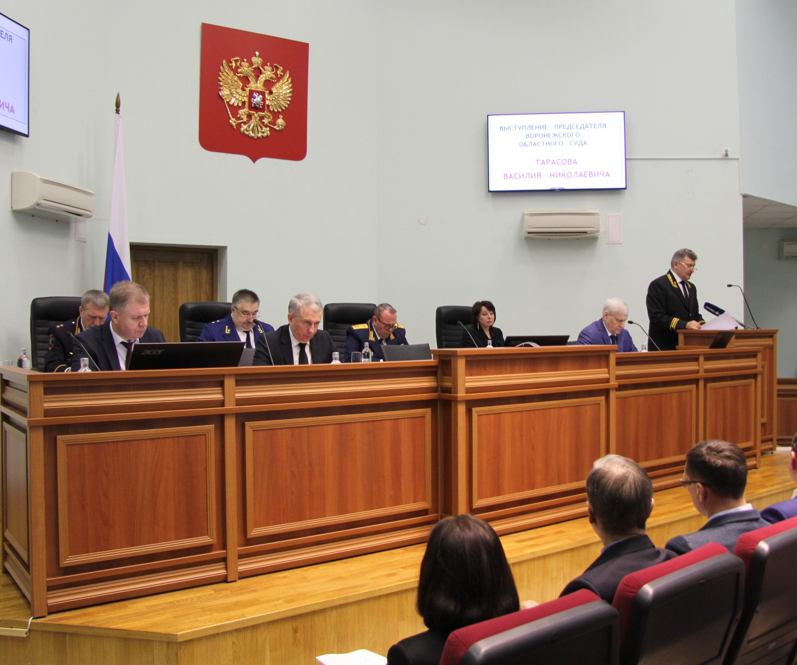 Открыл итоговое совещание, поприветствовал его участников и выступил с докладом о работе судов области в 2023 году председатель Воронежского областного суда В.Н. Тарасов.