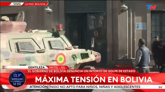 В Боливии состоялась попытка военного переворота. Вооружённый мятеж возглавил генерал Хуан Хосе Суньига, в ходе развития событий военные даже перешли к штурму дворца президента. Суньига заявил, что в Боливии якобы необходимо вернуть демократию и освободить политзаключённых. На деле мятежники призывали к освобождению губернатора департамента Санта-Крус Луиса Фернандо Камачо, который является подозреваемым по делу госперевороте в 2019 году.