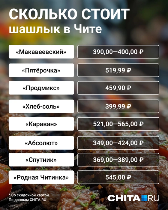 Среди популярных читинских супермаркетов шашлыки были везде в том или ином виде. Единственное, что в «Хлеб-Соли» мясо замороженное и стоит 399 рублей. В «Караване», «Родной Читинке», «Пятерочке», «Абсолюте», «Спутнике», «Продмиксе» и «Маккавеевском» шашлык есть и стоит по-разному.