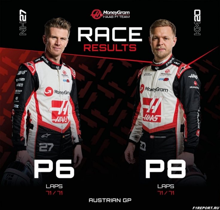 В команде Haas довольны итогами гонки в Австрии, ведь они смогли набрать очки сразу двумя болидами. Нико Хюлькенберг: "Это была отличная гонка. Особенно мне понравилась борьба с Серхио Пересом на последних кругах. В одном из поворотов я позволил ему выйти вперёд, а потом воспользовался правом на открытие крыла и опередил его". Кевин Магнуссен: "Гоночный уикэнд сложился для нас самым лучшим образом. Мы действовали чисто и без ошибок. В итоге, это позволило нам набрать очки двумя болидами и укрепить свои позиции в Кубке конструкторов".