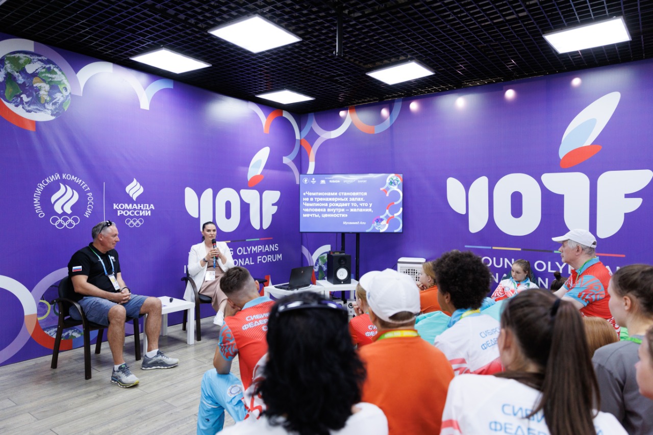 В завершающий день Форума в гости к подрастающему поколению будущих чемпионов приехал Президент ОКР, четырехкратный Олимпийским чемпион по фехтованию Станислав Поздняков. Главной темой теплой, дружеской беседы было то, как истинные Олимпийские ценности – дружба, уважение и стремление к совершенству, честная игра – могут и должны помогать уверенно и правильно пройти свой путь в мире спорта высших достижений.