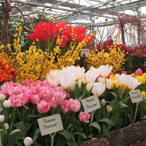 Около 10 тысяч тюльпанов, нарциссов, крокусов, гиацинтов, мускари, а также лилии, луки, персик, ландыши, сирень, подснежники, вишня, сакура, магнолии, миндаль и прочие растения расцвели на 2 месяца раньше природного срока, чтобы порадовать москвичей и гостей российской столицы к началу весны.