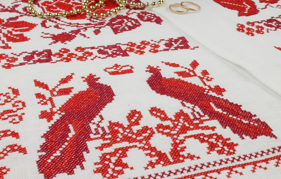 Свадебные рушники: Узор на свадебных полотенцах часто включал изображения пары птиц, дерева жизни, солнца и других символов, связанных с плодородием и семейным счастьем.