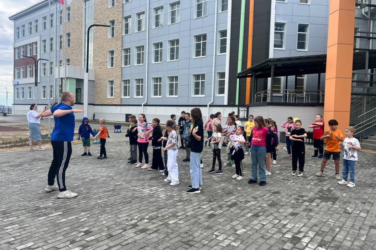 Для школьников, посещающих летний лагерь, организовали утреннюю зарядку. К ней присоединились порядка 50 ребят.