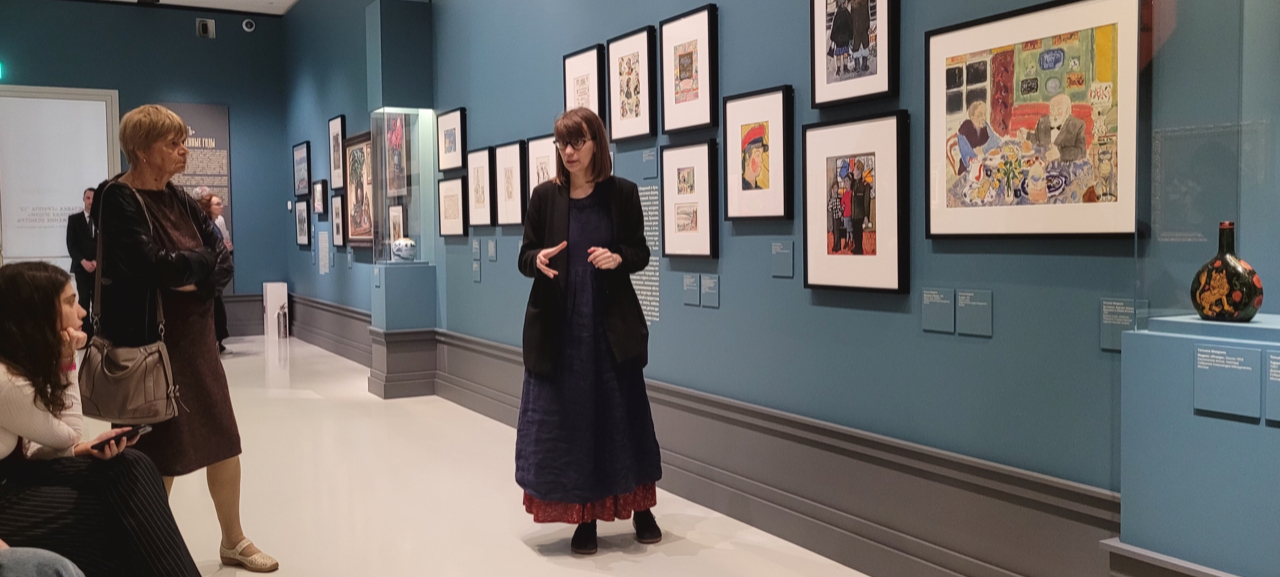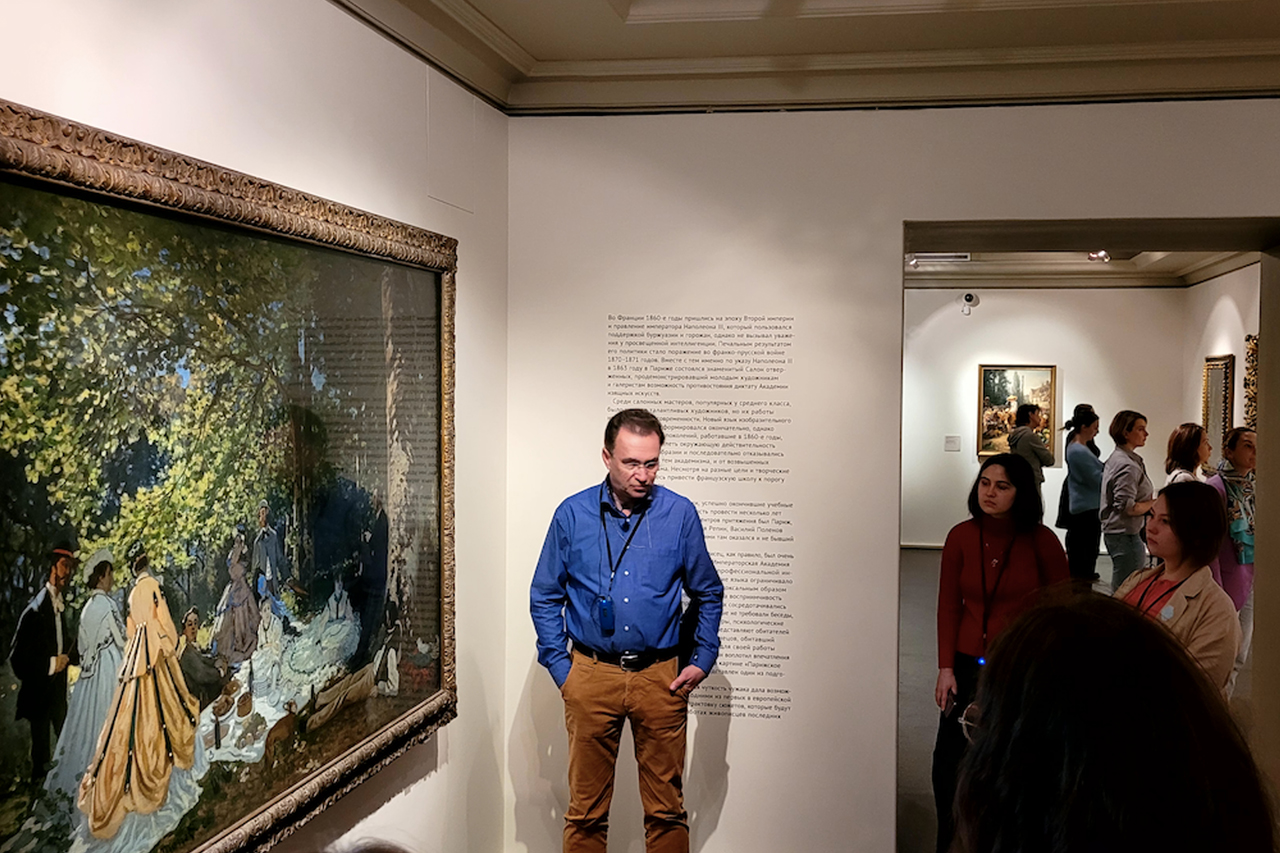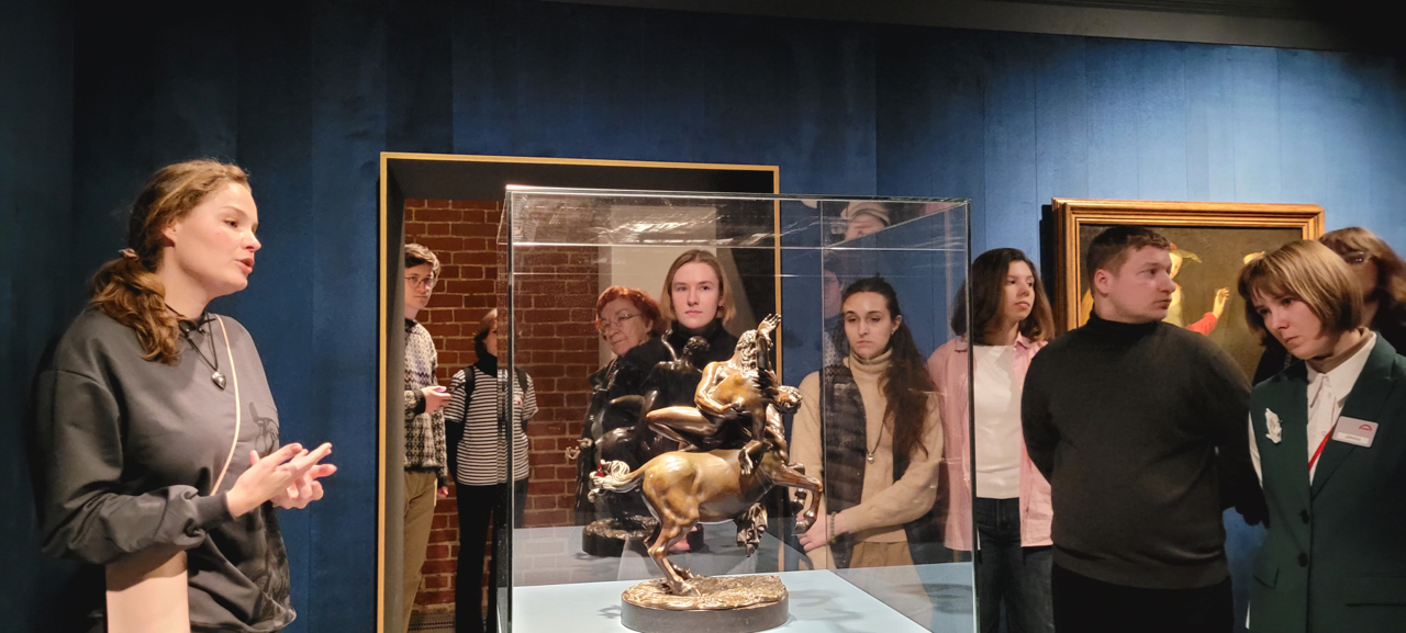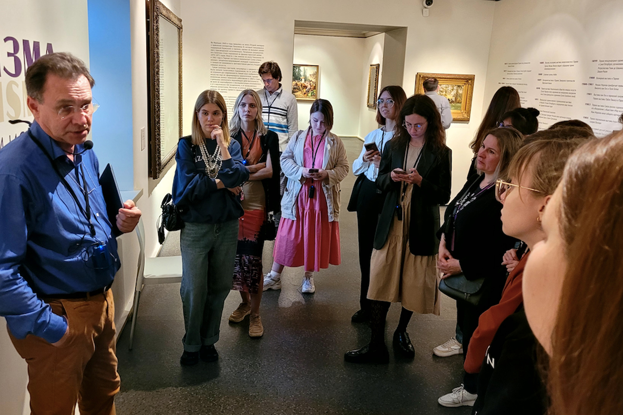 Во время экскурсий студенты и кураторы много беседовали о взаимодействии русского и зарубежного искусства в ХХ веке, о том, как вписать творчество отечественных художников в общемировой контекст, о способах "столкнуть" и сопоставить между собой искусство старое и современное, о том, как художественными средствами формируется миф о национальной истории и манящей экзотической культуре.