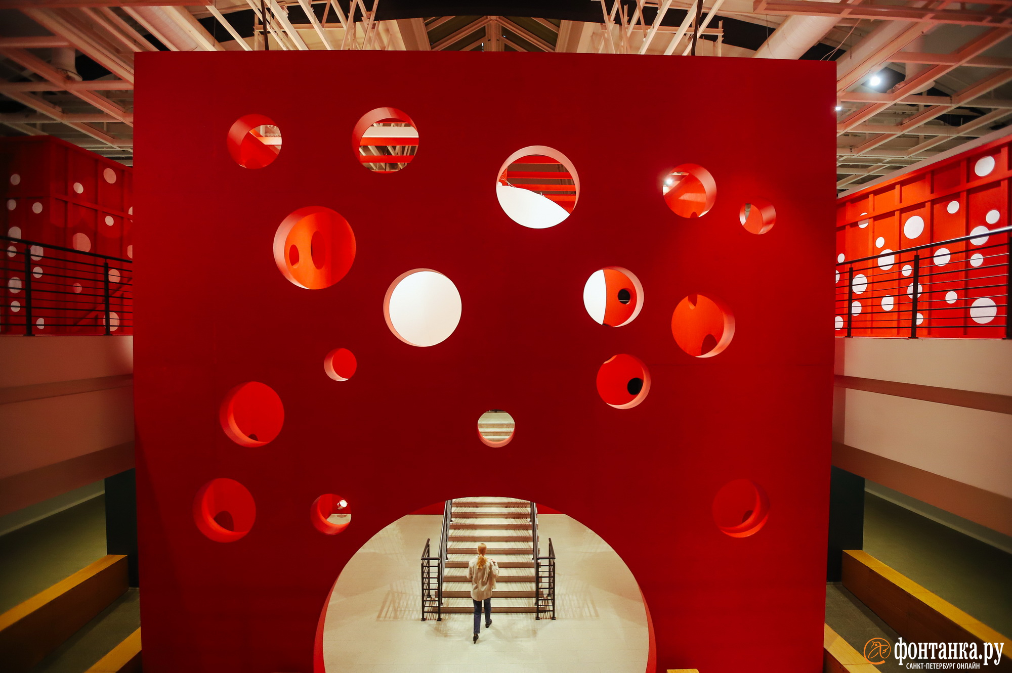 Бодрящее «мухоморовое» оформление выставки, вызывающее в памяти безумные орнаменты японской художницы Яёи Кусамы, захватило все внутреннее пространство «Манежа» и даже копию памятника Пушкину с одноименной улицы, вместе с лавочками воссозданную в аванзале. В гигантском красном кубе, установленном в конце зала, белые кружки заменили отверстиями, разросшимися до масштабов арки и светящегося шара. Интерьерами дело не ограничилось, и пятнистое буйство «выплеснулось» в уличное пространство позади «Манежа» в виде инопланетных зарослей. Тем временем другая «волна» захватила фасад на Исаакиевской, не оставляя шанса прохожим не заметить выставку.