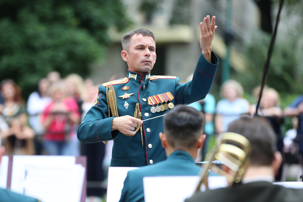 Коллектив под руководством дирижера майора Дмитрия Малькова подготовил для своего воскресного выступления репертуар, наиболее полно показывающий возможности военного духового оркестра.