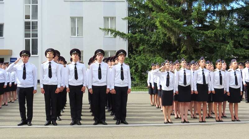 В завершение выпускники возложили цветы к памятнику сотрудникам органов внутренних дел, погибшим при исполнении служебного долга и прошли торжественным маршем по плацу филиала с традиционным подбрасыванием монет, после чего весь личный состав филиала исполнил песню «Вперёд, Россия!».
