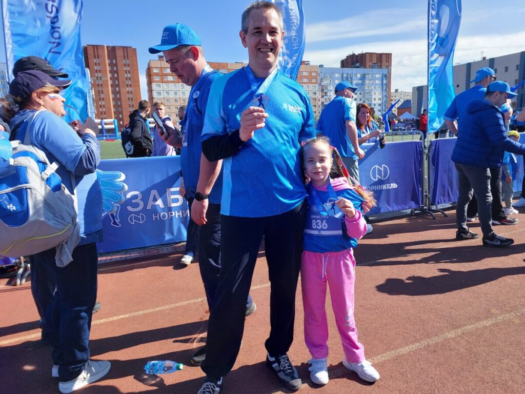 Папа и дочка Якуповы достойно преодолели километр. Папа трудится в «Норильскникельремонте» главным специалистом, восьмилетняя дочка Катя сказала, что отлично проводит лето. В своей династии они представители второго поколения. Первыми Норильск открыли мать и отец, которые приехали в северный город в 1963 году.