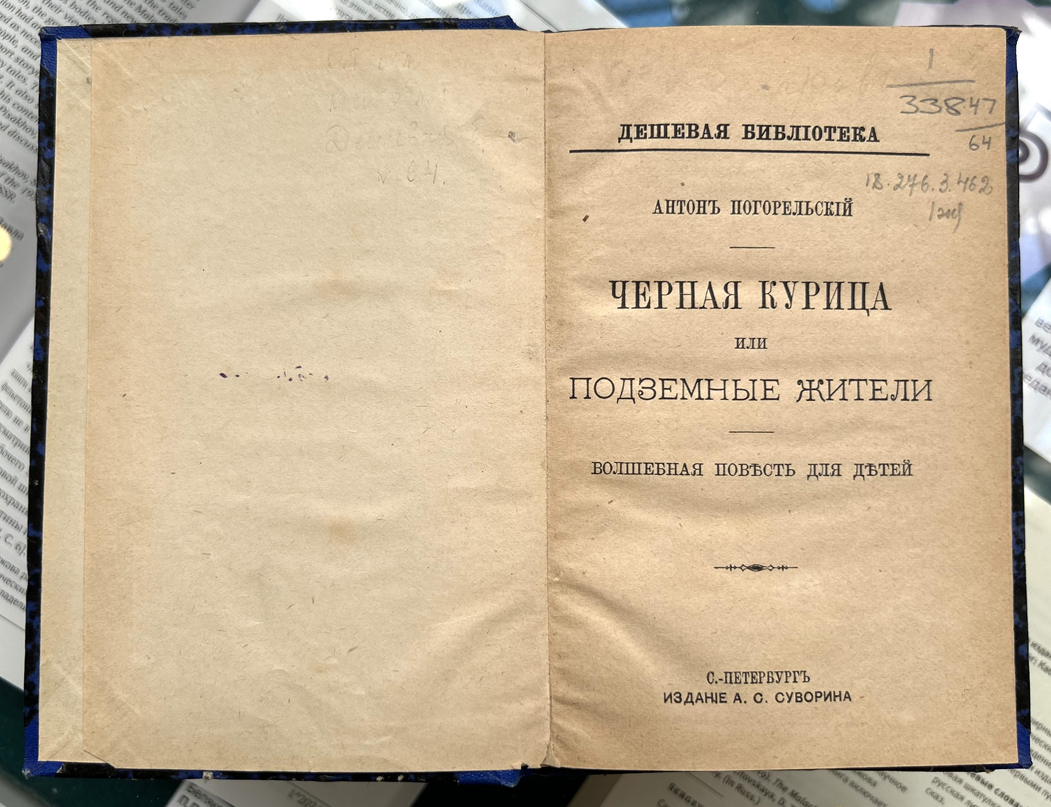 Привлекает внимание книга «Чёрная курица, или Подземные жители» Антония Погорельского (1888 г.), опубликованная в типографии Алексея Суворина в Санкт-Петербурге в серии «Дешевая библиотека».
