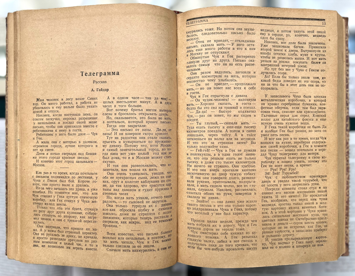Среди экспонатов – первая публикация рассказа Аркадия Гайдара «Чук и Гек» в журнале «Красная новь» (1939 г.). Тогда труд вышел под названием «Телеграмма».