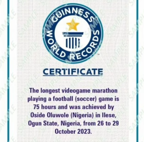 Самый продолжительный видеоигровой марафон по футболу составляет 75 часов и был достигнут Осиде Олуволе (Нигерия) в Илезе, штат Огун, Нигерия, с 26 по 29 октября 2023 года.
