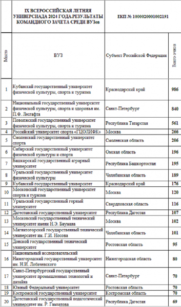 НГУ им. Лесгафта, Санкт-Петербург стал вторым в командном зачете вузов, набрав 840 баллов! Наши ребята становились призерами и победителями в гандболе, волейболе, плавании, шахматах, настольном теннисе, самбо, боксе, дзюдо, легкой атлетике, тхэквондо (ВТФ) и спортивной борьбе (греко-римской, женской и вольной).
