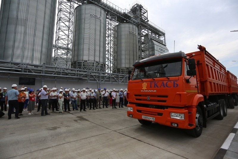 Итак, весь комплекс запущен. По полосе движутся автомобили. Осуществляется выгрузка зерна. Сергей Пятахин подробно повествует о работе комплекса.