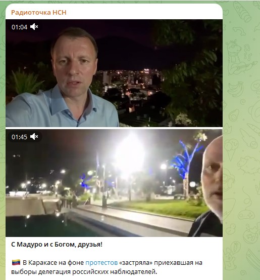 По последним данным, в Каракасе на фоне протестов "застряла" приехавшая на выборы делегация наблюдателей от России. По данным депутата Госдумы Алексея Волоцкова, русским представителям из-за беспорядков пришлось укрыться в посольстве России: проехать в гостиницу мимо протестующих с битами, палками и коктейлями Молотова они не решились.