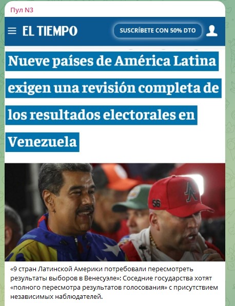 Также сообщается, что девять стран Латинской Америки потребовали пересмотреть результаты выборов в Венесуэле. Соседние государства хотят "полного пересмотра результатов голосования" с присутствием независимых наблюдателей.