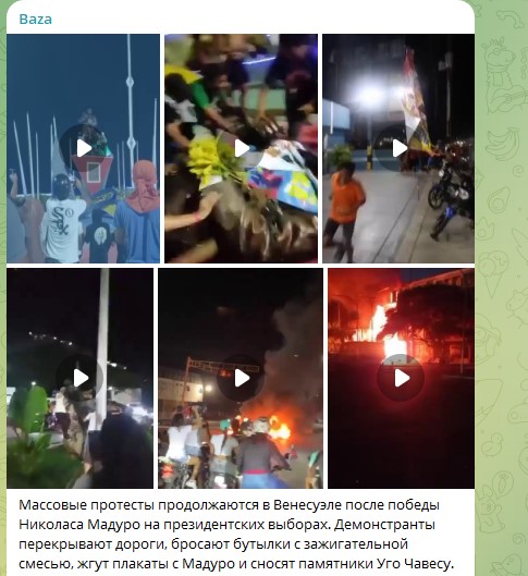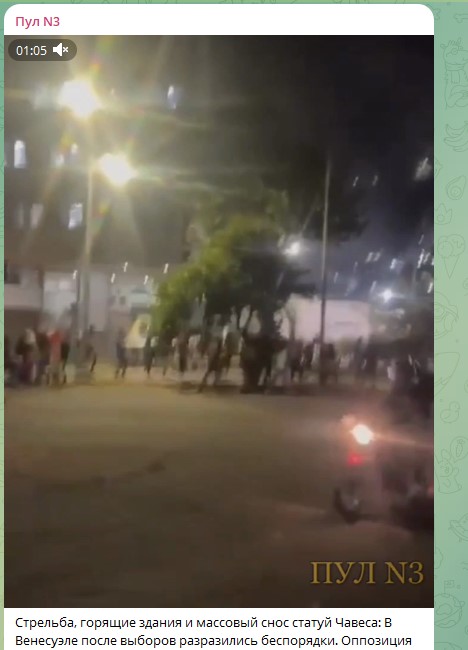 На кадрах, снятых местными СМИ видно, что в Венесуэле отрабатывается классический "майдан" или цветная революция - слышна стрельба, горящие здания и массовый снос статуй Чавеса. Оппозиция официально не признала итоги выборов и назвала избранным президентом оппонента Николаса Мадуро, Эдмундо Гонсалеса Уррутиа. Акции протеста сторонников Уррутиа быстро приобрели насильственный характер - демонстранты начали жечь покрышки и мусор в центре города, а также кидать в полицейских камни и коктейли Молотова. Подобное происходило во множестве стран, куда вмешивались США, ярким и печальным примером стала Украина.