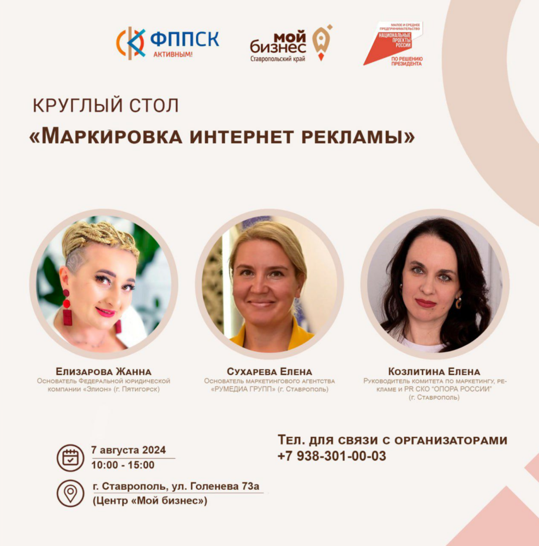Специально для предпринимателей Ставропольского края центром «Мой бизнес», функционирующим на базе некоммерческой организации «Фонд поддержки предпринимательства в Ставропольском крае» состоится круглый стол «Маркировка интернет-рекламы». Мероприятие пройдет 7 августа 2024г. с 10:00 до 15:00.
