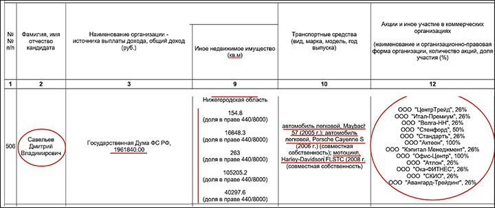 Будучи депутатом, Савельев сохранил доли в коммерческих структурах//Скриншот из материалов ЦИК России.