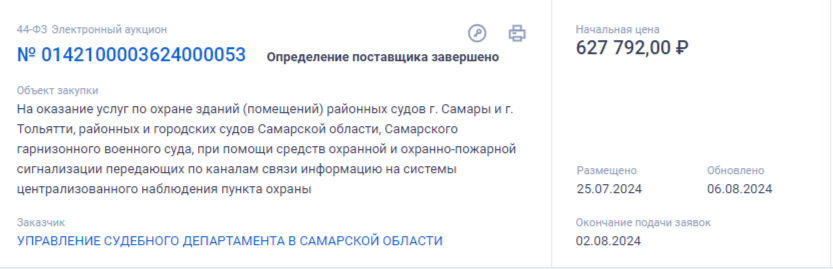 В Самарской области определили организацию, которая окажет услуги по охране зданий районных судов в Самаре и Тольятти, районных и городских судах региона, а также Самарского гарнизонного военного суда. Информация появилась на сайте госзакупок, 6 августа 2024 года.