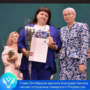По случаю 68-й годовщины со Дня образования городского округа Октябрьск, благодарственным письмом главы города Александры Гожей за добросовестный труд, профессионализм и ответственность награждена заместитель начальника межмуниципального отдела по г. Октябрьск, Шигонскому району Управления Росреестра по Самарской области Ольга Тимофеева.