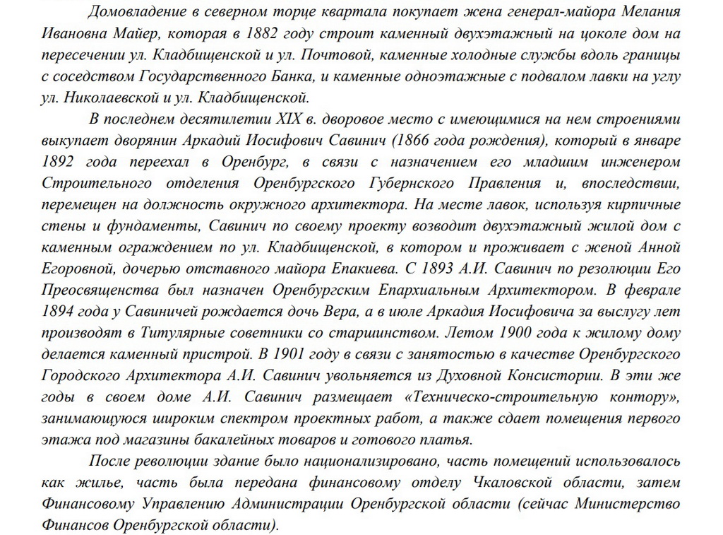 К слову, «Дом Савинича» строился в качестве жилого помещения. Сейчас же здание используется и как жилое, и как один из корпусов министерства финансов Оренбургской области. Представляет собой двухэтажный кирпичный дом с подвалом под вальмовой кровлей с аттиком в стиле эклектика.