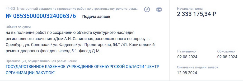 В Оренбурге планируют восстановить объект культурного наследия регионального значения за 2 миллиона 333 тысячи рублей. Речь про «Дом Аркадия Иосифовича Савинича», расположенный на улицах Советская/Фадеева/Пролетарская, 54/1/41. Большая часть элементов этого здания находится в аварийном, ограничено-работоспособном состоянии.