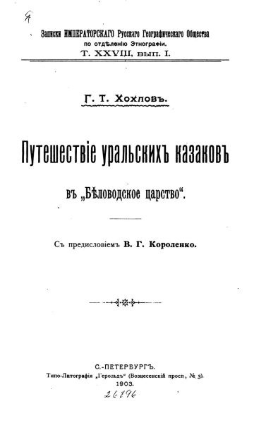 В связи с этим уместно вспомнить, что в 1903 году в трудах Императорского Русского географического общества под редакцией писателя В.Г. Короленко вышла книга Г.Т. Хохлова «Путешествие уральских казаков в «Беловодское царство».