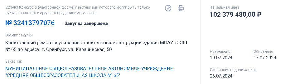 Как мы рассказывали, после возбуждения уголовного дела и увольнения следователя в школе №65 Оренбурга все же начался ремонт. Согласно закупке, размещенной на специализированном сайте, стоимость работ составит порядка 102 млн рублей. Выполнять капитальный ремонт МОАУ «СОШ № 65 на ул. Карачинской будет ООО «ИСК«Салмыш».