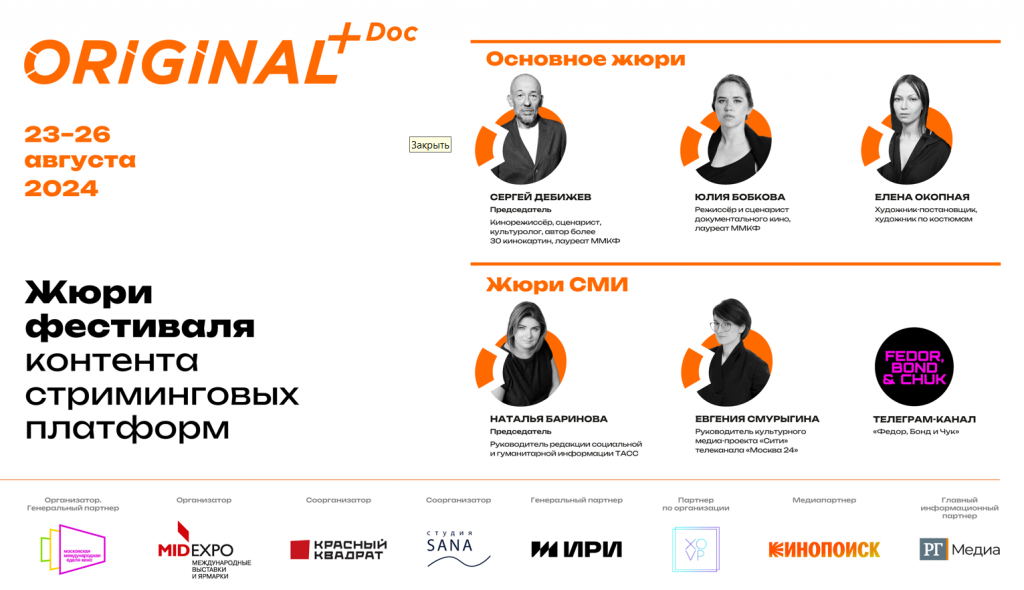 Свои проекты представят крупнейшие стриминговые платформы страны — Okko, Kion, Wink, Start, Premier, Кинопоиск, Смотрим, Kino1TV, Rutube, RT.doc, Amediateka.