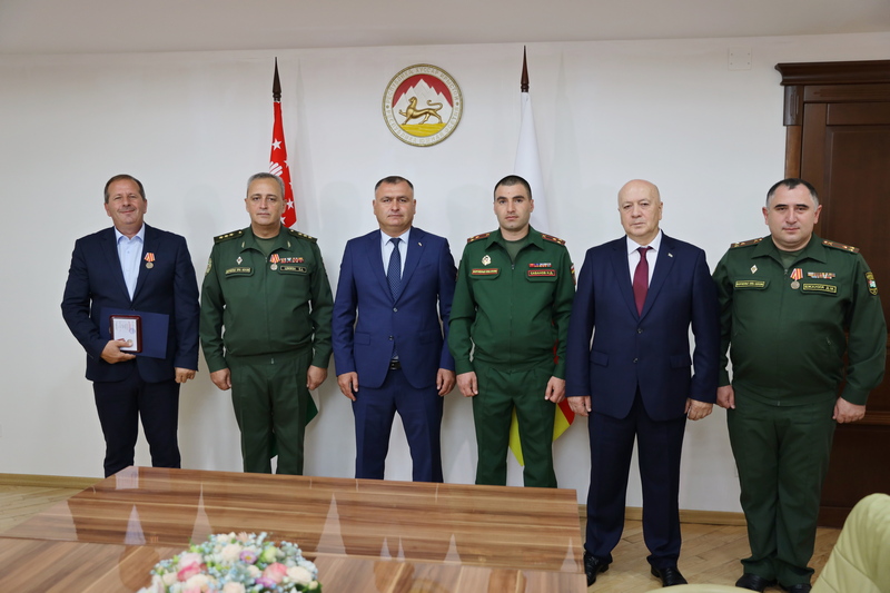 В составе делегации: Первый заместитель Министра обороны генерал-полковник Беслан Цвижба, Чрезвычайный и Полномочный Посол Республики Абхазия в Республике Южная Осетия Алан Елбакиев, заместитель Министра обороны, Статс-секретарь полковник Давид Бжания и Глава Администрации села Члоу Очамчырского района Аслан Сангулия.