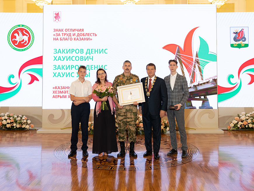 За пример патриотизма и мужества знаки отличия «За труд и доблесть на благо Казани» получили Денис Закиров и Павел Лазарев. За вклад в воспитание детей и заслуги в укреплении института семьи Почетную грамоту Казани получил отец Героя РФ Альберт Сафиуллин. Такую же награду вручили воспитателю учебного курса Казанского суворовского военного училища Дамиру Исламову.