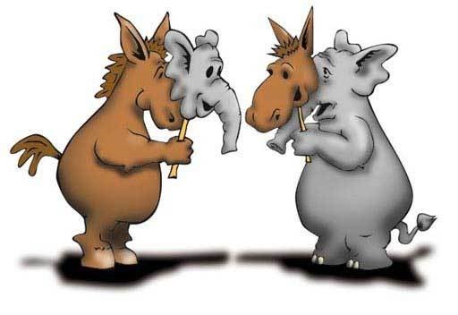 Писали у нас когда-то, что демократов и республиканцев в США невозможно отличить по содержанию их программ – две партии просто разыгрывают места во власти, чтобы гарантировать внутреннюю стабильность в Америке. Вот такие рисунки бытовали в прессе: