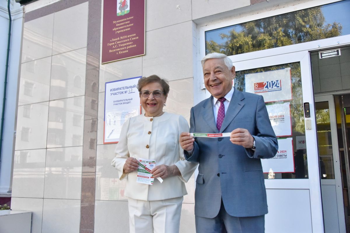 Секретарь Татарстанского реготделения «Единой России», председатель Госсовета Фарид Мухаметшин проголосовал в лицее №116 имени Героя СССР А.С. Умеркина в Казани. На участок он приехал вместе с супругой Луизой Акрамовной.