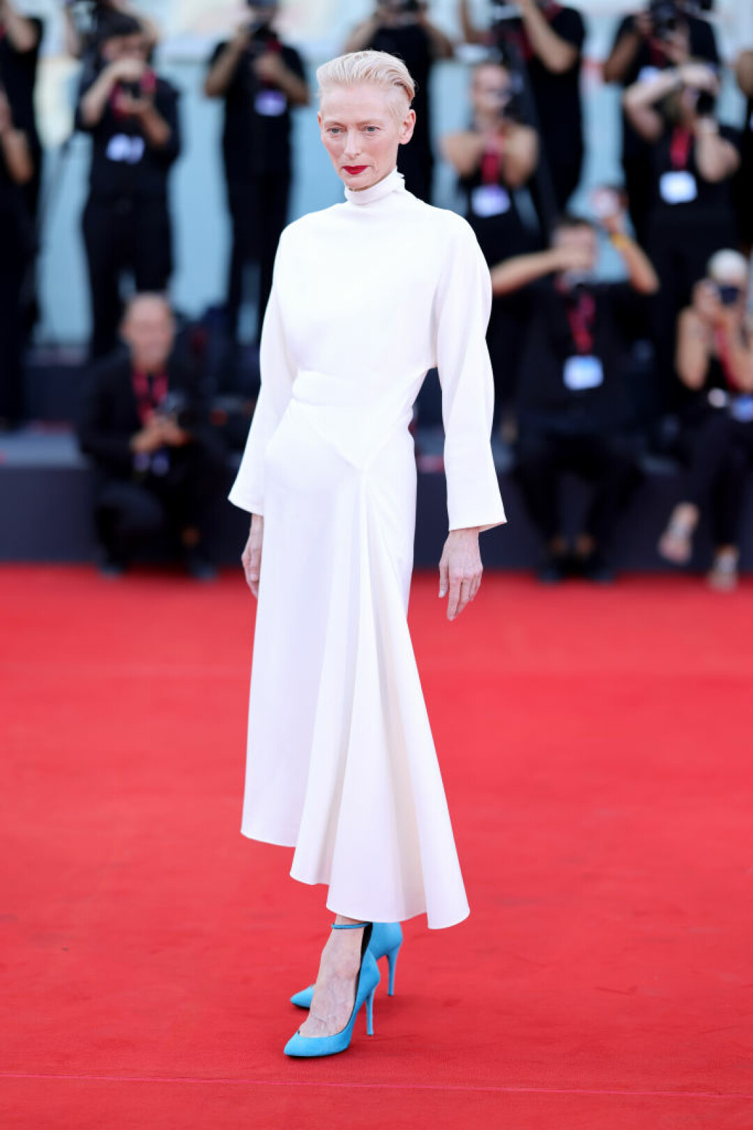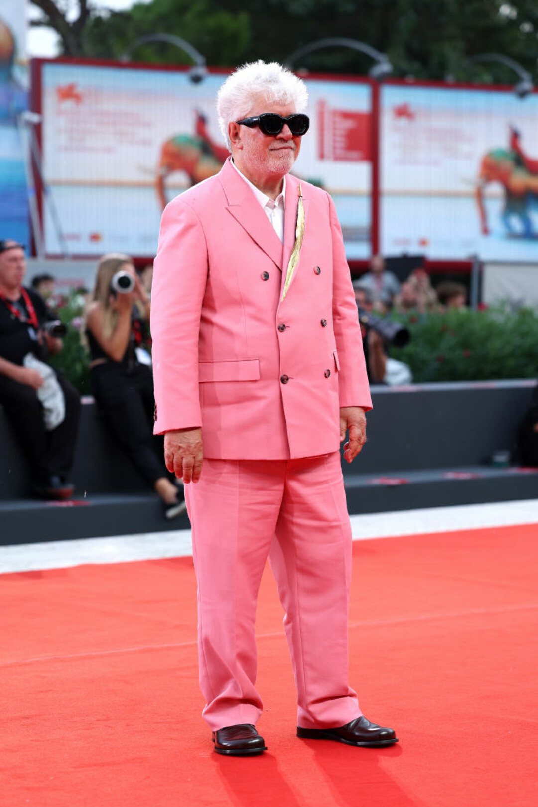 «Золотой лев» — у короля драмы и колорблока Педро Альмодовара (на счету награды — от «Сезара» и «Гойи» до «Оскара») за первый англоязычный фильм «Комната по соседству». Для красной дорожки режиссер выбрал розовую двойку Loewe с золотистой брошью-пером. А главная звезда его фильма Тильда Суинтон на премьеру «Квира» надела минималистичное платье Alaïa с асимметричной юбкой и акцентными плечами, замиксовав его с бирюзовыми туфлями на высокой шпильке, фирменным андеркатом и ярко-красной помадой.
