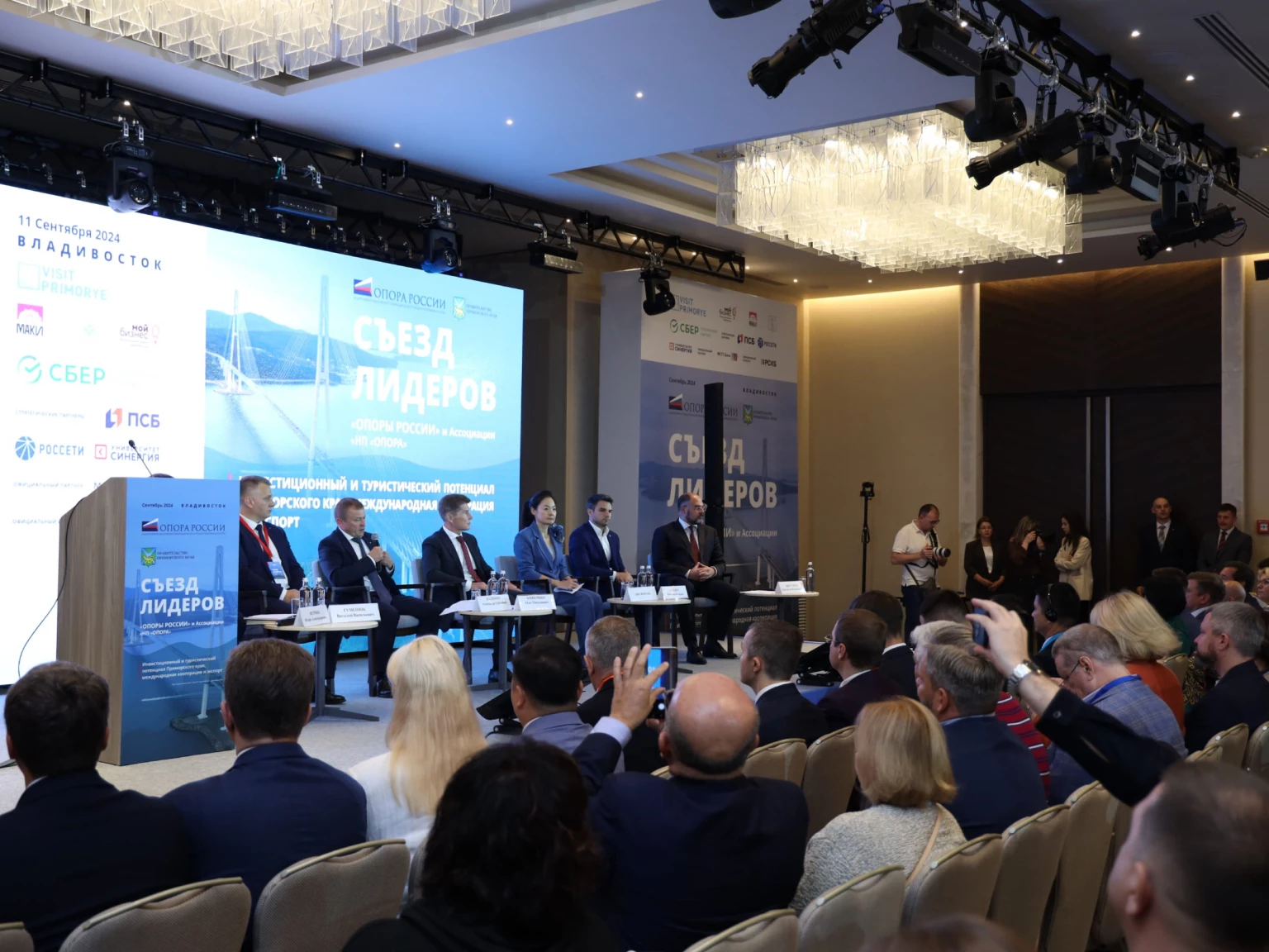 Деловую программу Съезда лидеров «ОПОРЫ РОССИИ» и Ассоциации «НП «ОПОРА» во Владивостоке 11 сентября открыла пленарная сессия «Инвестиционный и туристический потенциал Приморского края, международная кооперация и экспорт». Почетным гостем мероприятия выступил Губернатор Приморского края Олег Кожемяко. В ходе дискуссии представители власти, институтов развития банковского сообщества, предприниматели обсудили преференциальные режимы для бизнеса, инфраструктуру поддержки сектора МСП в регионе, федеральные и региональные меры господдержки малого бизнеса и другие вопросы. Модератором сессии выступил Президент «ОПОРЫ РОССИИ» Александр Калинин.