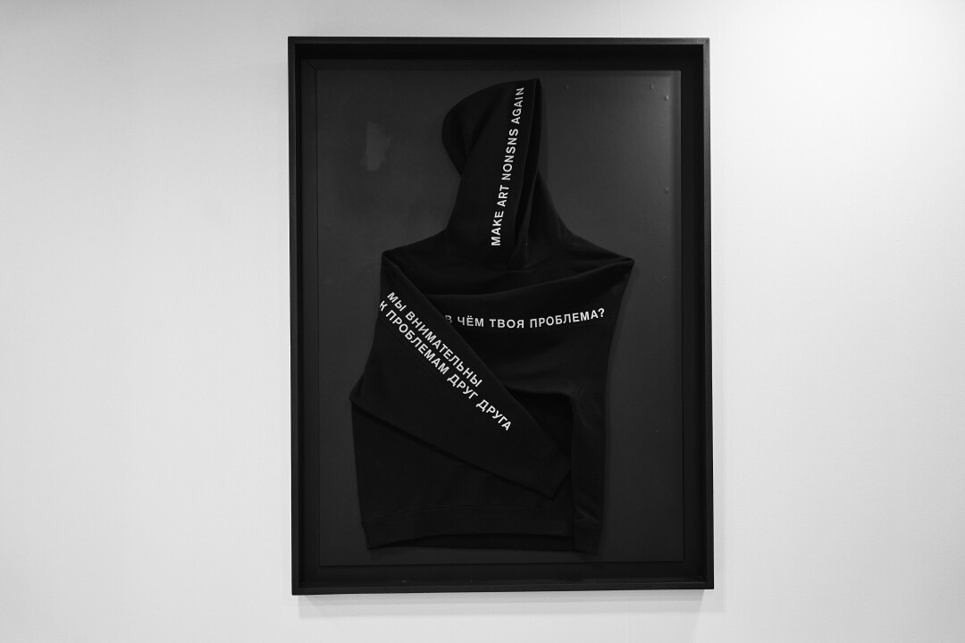 Интересно, что арт-объекты вывешены словно в шоуруме. Говорят, на территории нового выставочного пространства FUTURO когда-то был магазин, а еще раньше — галерея. Может быть, мы разгадывали не тот ребус, но, кажется, история локации обыграна идеально. А что видите вы?