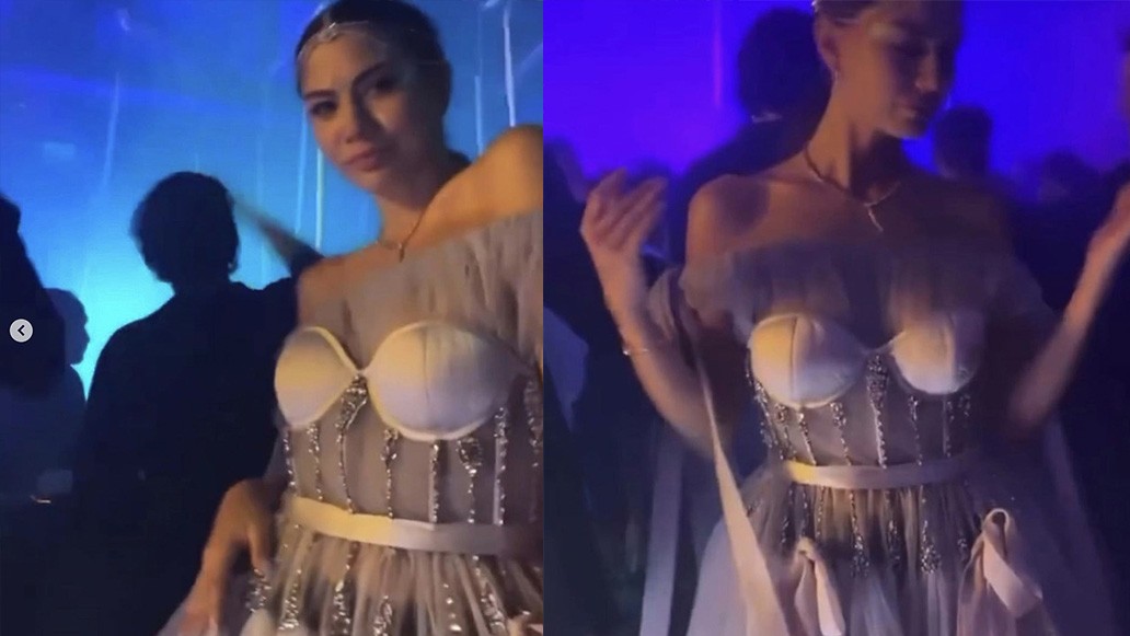 После официальной части Эбру Шахин выходила к гостям в течение празднества еще в двух нарядах. Известная актриса сначала надела платье от Saliha Balta с корсетным кружевным боди, такими же перчатками и легкой тканью в виде парео. А затем на вечеринке облачилась в мини-платье того же Amor Garibovic, сменив ажурные перчатки на более плотные и добавив объемные серьги, выполненные из того же материала, что и сам наряд.