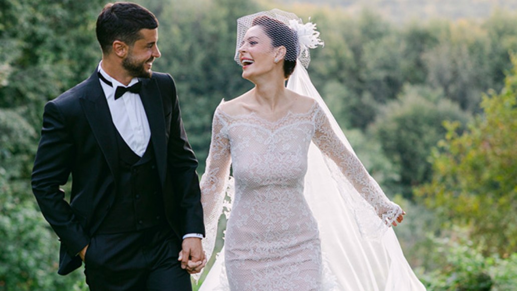После немноголюдной церемонии в Македонии, на родине жениха, знаменитая пара организовала более масштабные гуляния там, где зародилась их любовь – в Алачатах, деревеньке на турецком полуострове Чешме на берегу Эгейского моря. Здесь невеста под венец шла в свадебном платье от бренда Danielle Frankel А-образного кроя с бретелями и корсетом, а также тюлевыми перчатками.