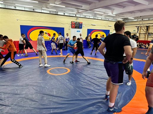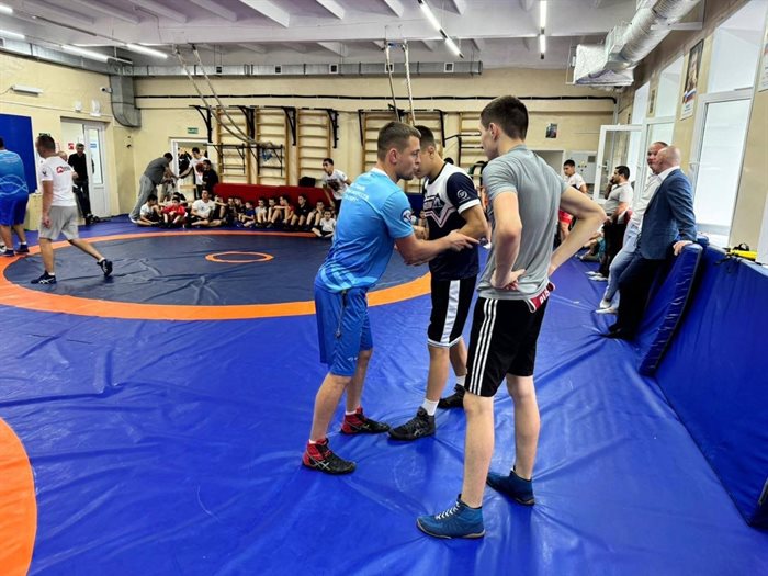 Старшие спортсмены работали на ковре, ребята из младшей возрастной группы наблюдали за процессом.
