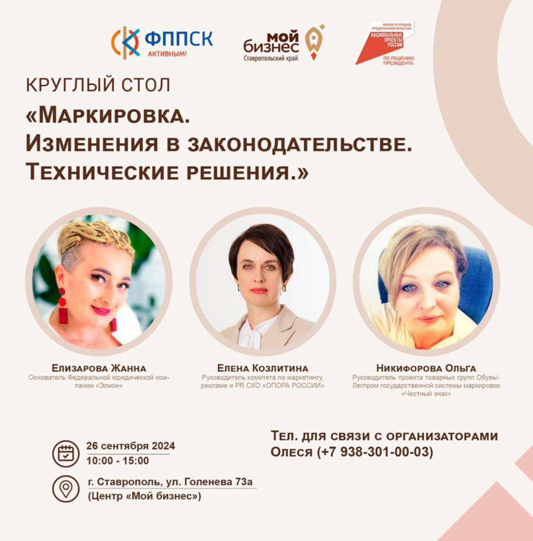 Специально для предпринимателей Ставропольского края центром «Мой Бизнес», функционирующим на базе Некоммерческой организации «Фонд поддержки предпринимательства в Ставропольском крае», 26 сентября с 10:00 до 15:00 будет проводиться круглый стол «Маркировка. Изменения в законодательстве. Технические решения».