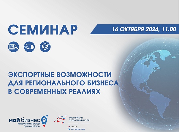 16 октября в 11.00 состоится очный семинар «Экспортные возможности для регионального бизнеса в современных реалиях» с участием министра экономического развития Тульской области Александра Ярошевского. Место проведения: г. Тула, ул. Кирова, 135/1, Центр «Мой бизнес», конференц-зал Программа мероприятия: Актуальные вопросы таможенного контроля; Возможности Белорусской универсальной товарной биржи (БУТБ) в расширении рынков сбыта продукции; Меры поддержки экспортеров, кредитно-гарантийные услуги; Обсуждение вопросов в формате «круглого стола» Спикеры: Максим Великанов, начальник Тульской Таможни; Павел Татаренко, генеральный директор Региональной корпорации развития и поддержки Тульской области; Татьяна Осипова, руководитель проекта по развитию регионального бизнеса РЭЦ; Представители БУТБ. Предварительная регистрация до 15 октября, 17.00 мск Контактное лицо: Иванова Анастасия, начальник отдела аналитики и сопровождения ЦПЭ Тульской области, (4872) 25- 98-33, доб. 147 Мероприятие проводится в рамках национальных проектов «Малое и среднее предпринимательство» и «Международная кооперация и экспорт»