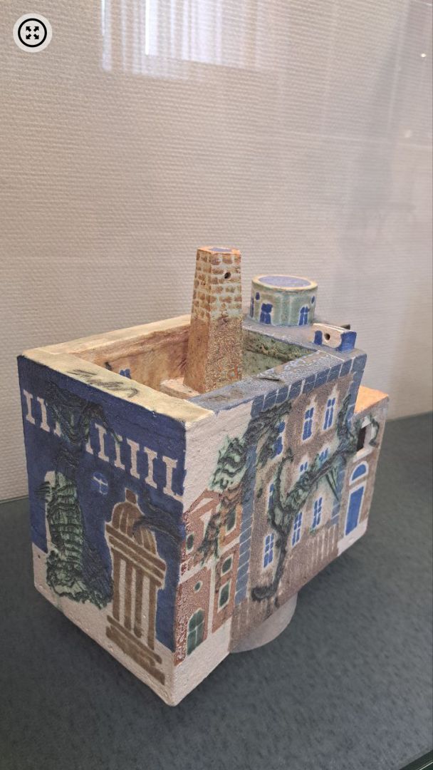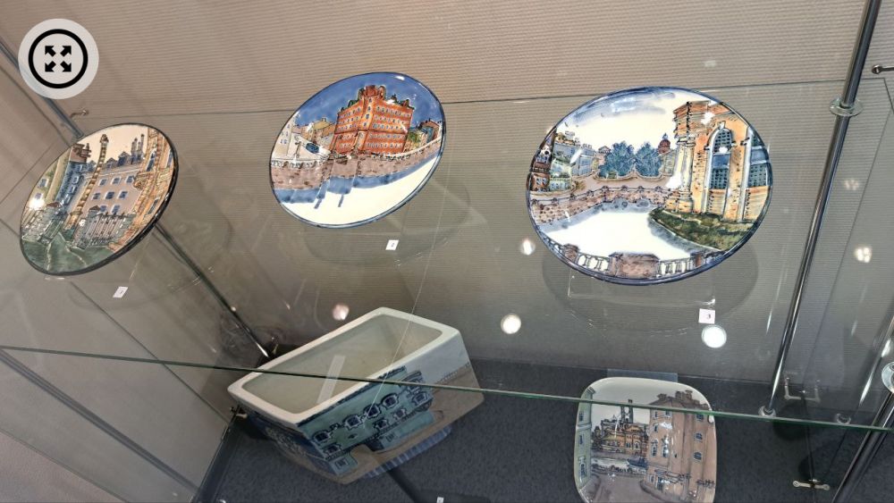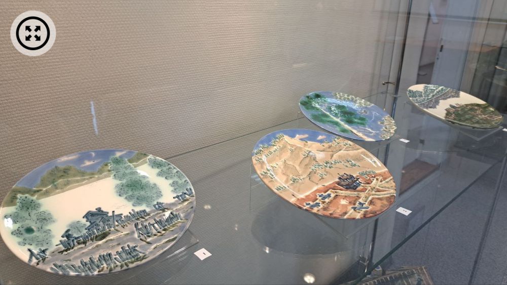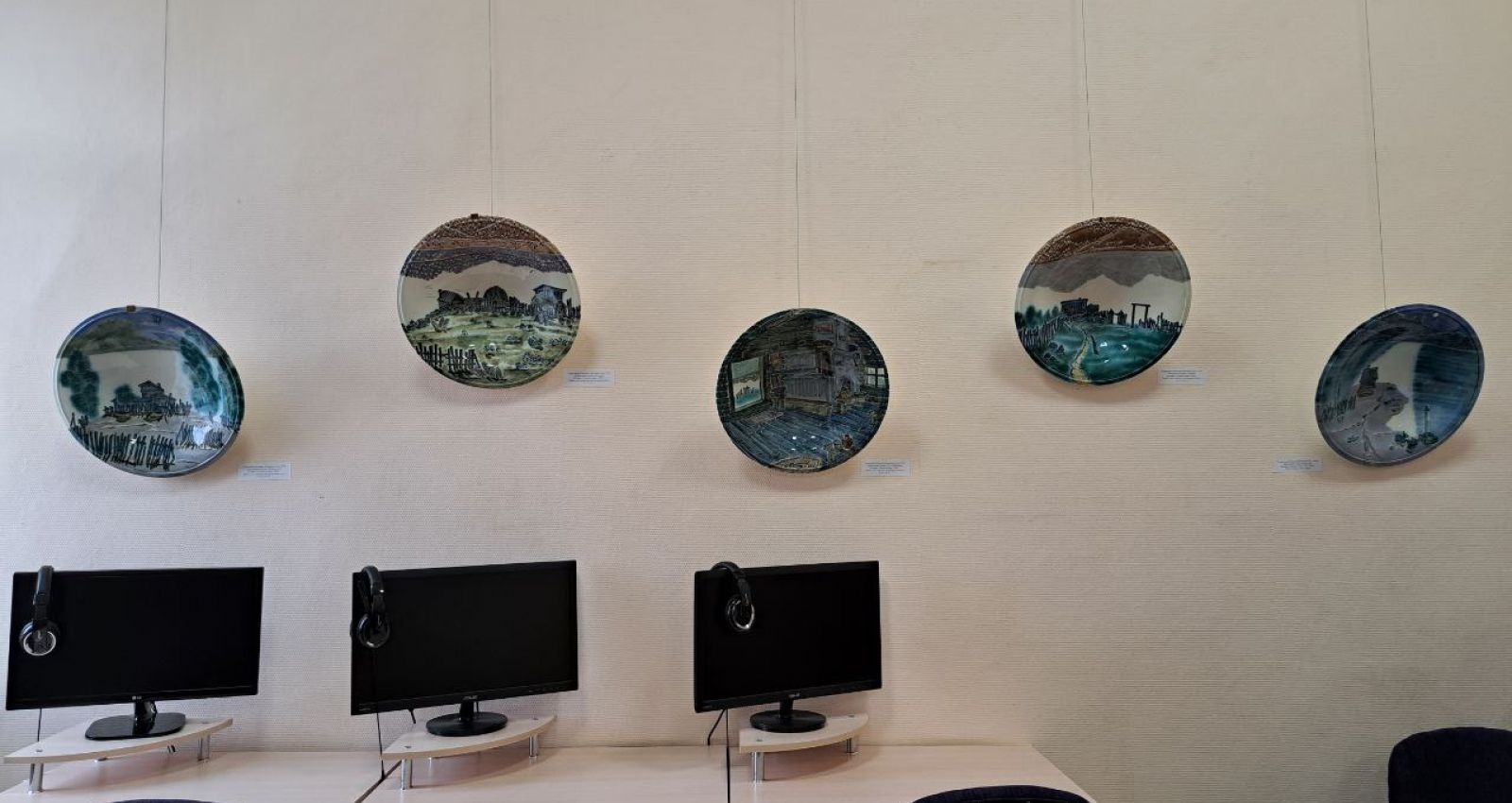 Экспозиция представлена произведениями из фаянса и шамота, выполненных в технике подглазурной росписи. В них отражены ведущие темы в творчестве художника: городской пейзаж, виды Алтая и Санкт-Петербурга. Отдельным лейтмотивом служит символ «окна», созвучный авторам серебряного века.